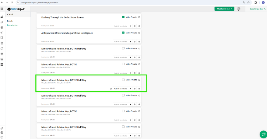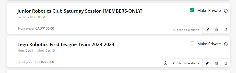- When you are editing the Events in MyStudio, it unpublishes them from the website. You are required to publish them again.