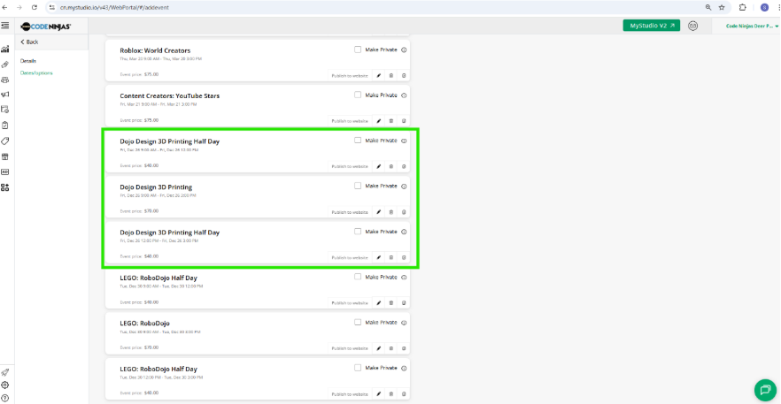 - Events in CAMPS have to be handled separately, so unified publishing can add events to both MyStudio and Franchise Dashboard, however, to Edit/Unpublish/Delete Events from Website, they have to be handled individually on MyStudio, and Franchise dashboard.