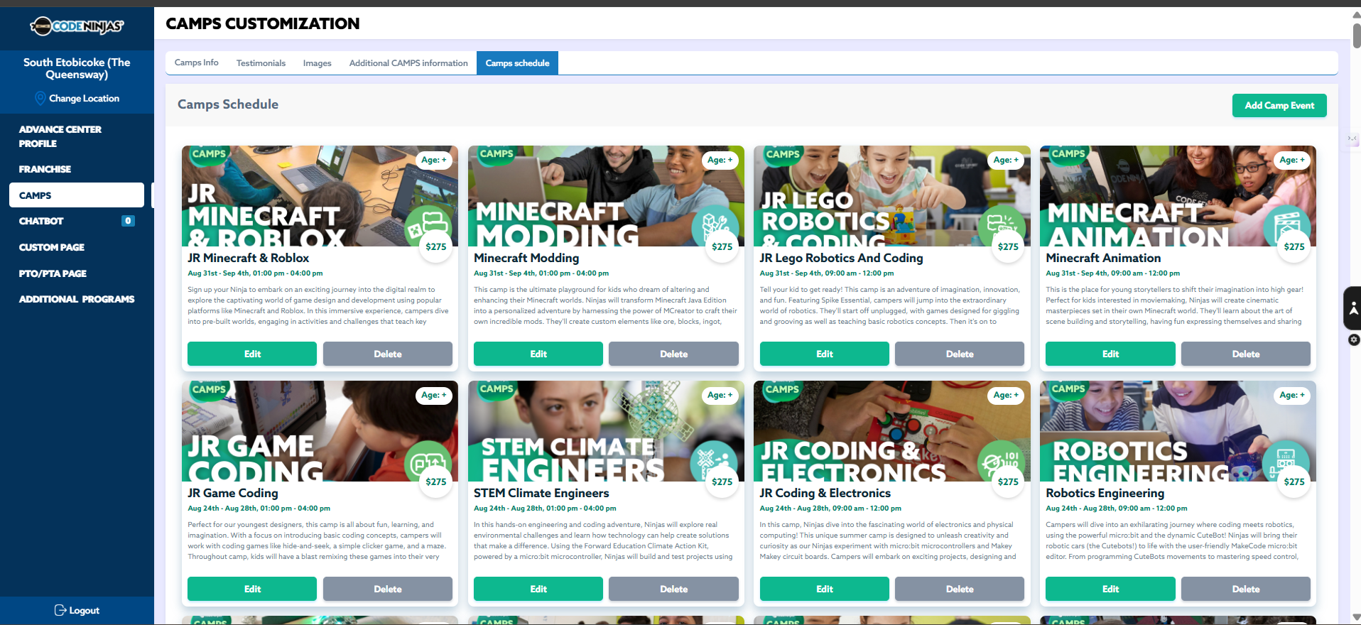 - Select the Edit icon on any of the CAMPS ,e.g., 2025 Winter Camps