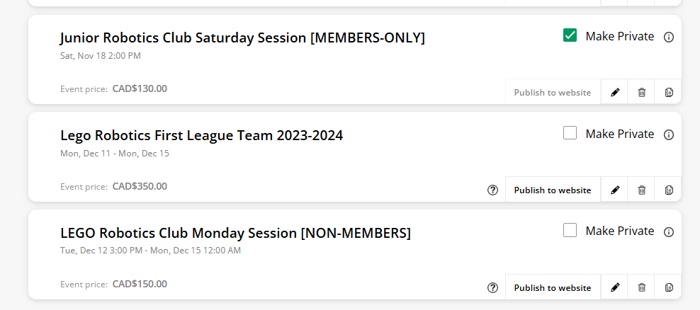 - Center Owners/Directors can also add new date/options to these events, Make them Private, Unpublish them from website, Edit Event Details, etc.