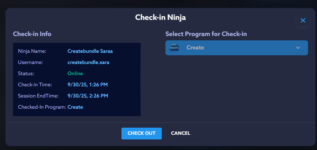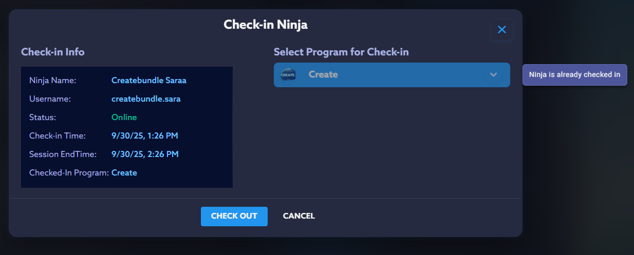 5. Click “Check Out” to Check out/Remove Ninja's checked-in session.