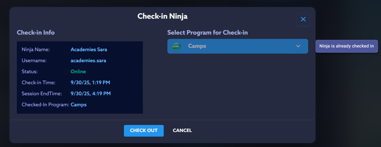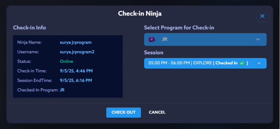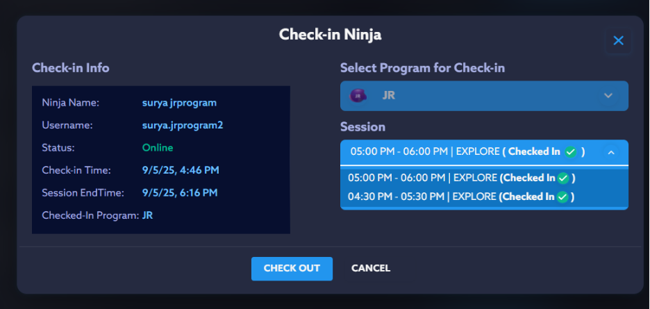 4. You can now select the Program and/or Program Session Ninja has been checked into. Click on "Check Out" to Remove their check-in, using the “Session” dropdown.