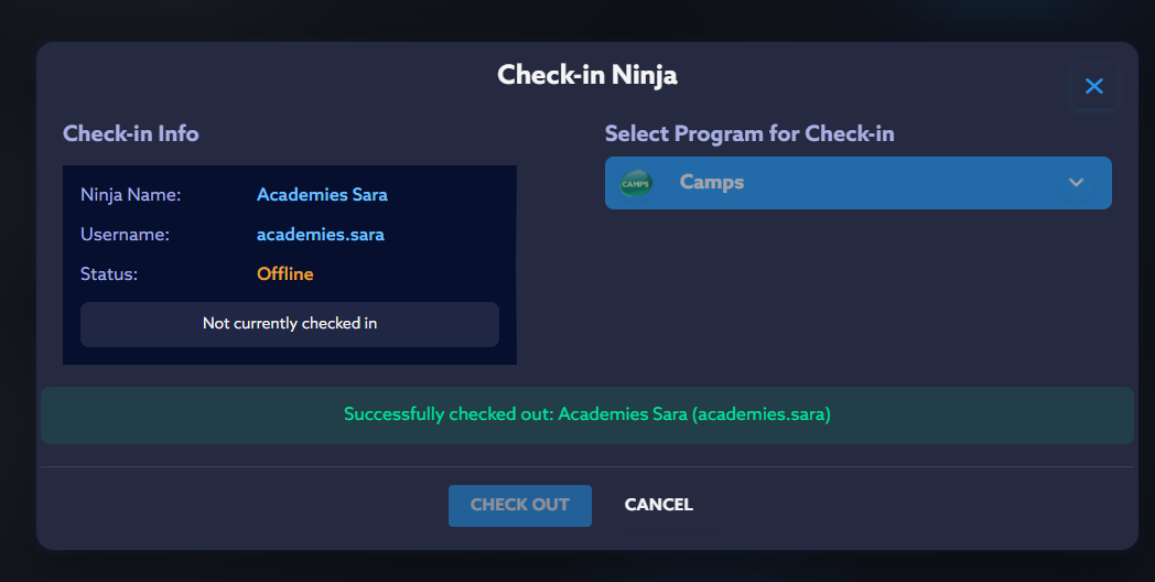 6. You’ll be able to see a notification on the footer of the “Check-in Ninja” Screen when the Ninja has been successfully checked out.