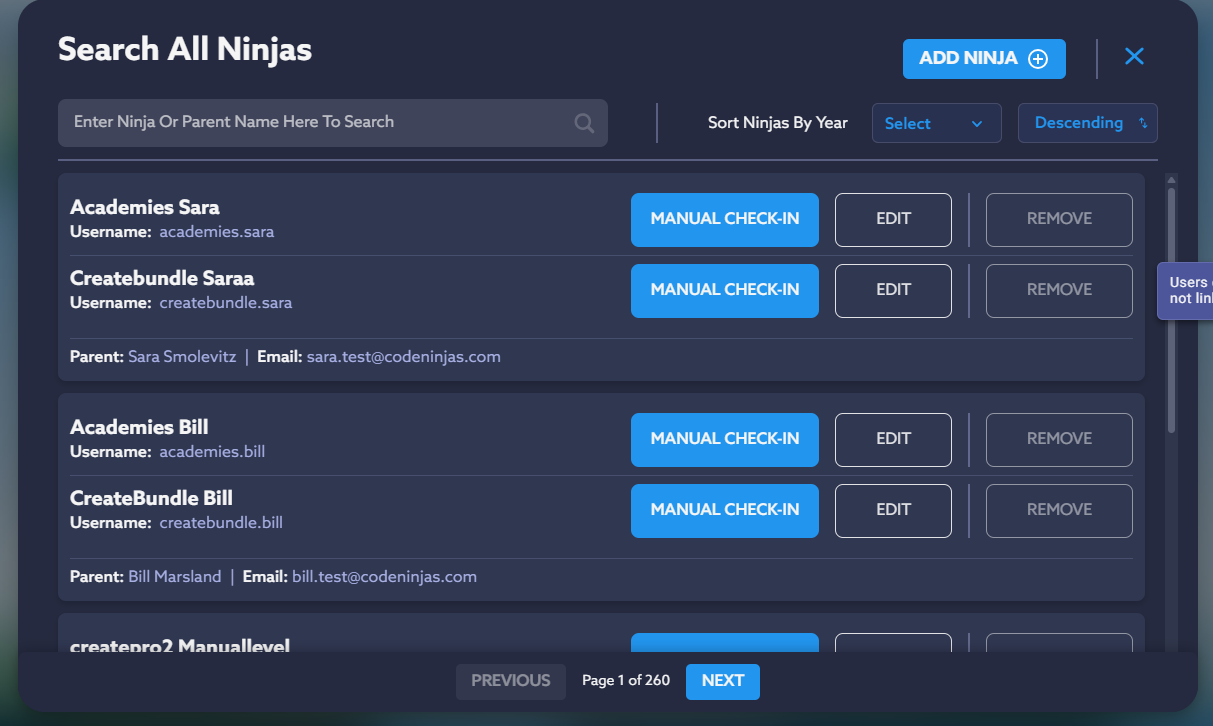 Mentioned below is a step by step guide to enable Ninja's Manual Check-in on the Center Portal. 1. Login to the Center Portal using your Code Ninjas credentials. And browse and click on the "Ninjas in Dojo" tab 2. When you're on the "Ninjas in Dojo" ...