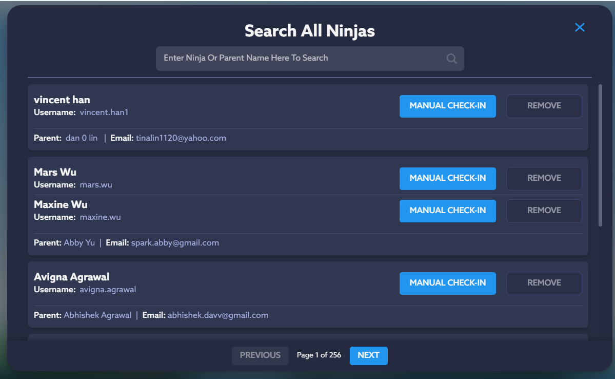 2. On the "Search All Ninjas" screen, search for Ninja's name you want to Manually check-in into "After School Program", then click "Manual Check-in".