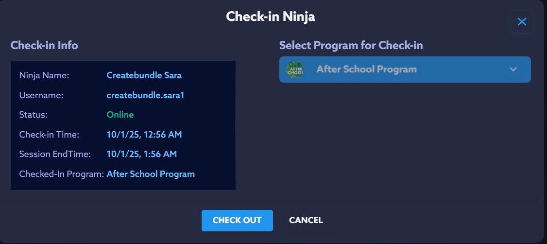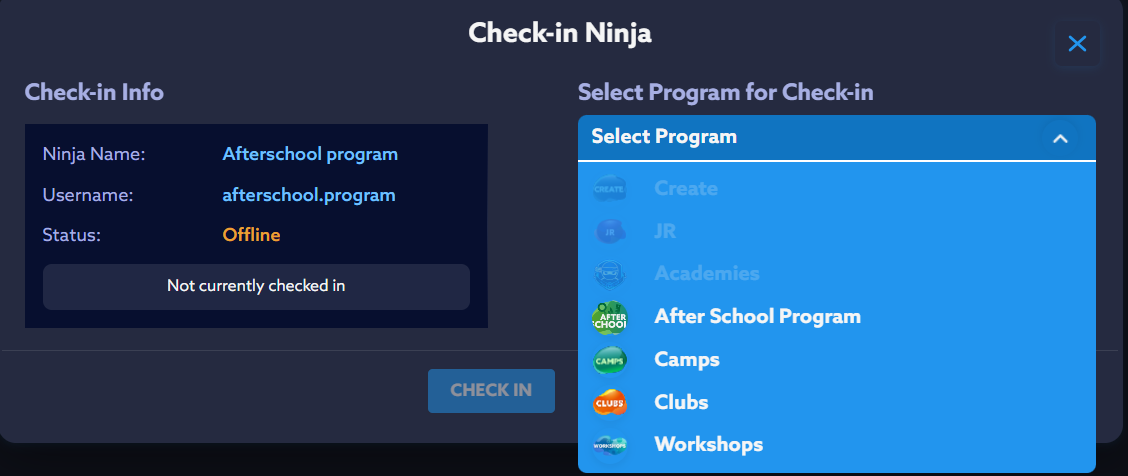 3. Select the program from dropdown you want to Check-in the Ninja. Click on "Check-in" to complete Ninja check-in to After School Program.