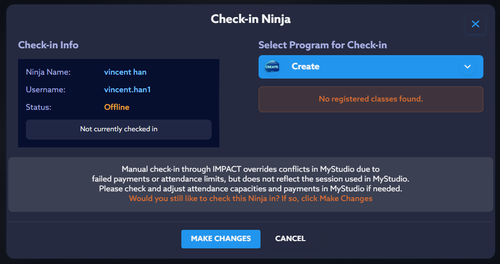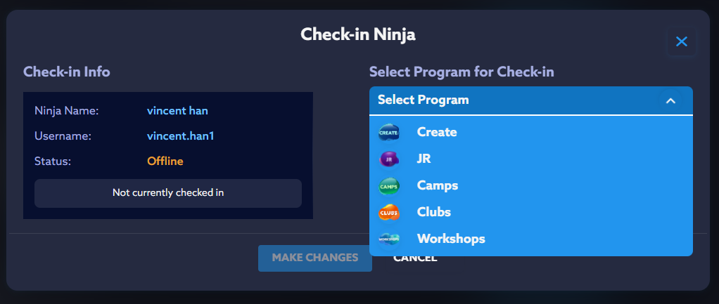 5.1 For CREATE/JR program types: Upon selecting the program, select the registered class that you want Ninja to be Checked in into. When you've selected the registered class, click "Make Changes".