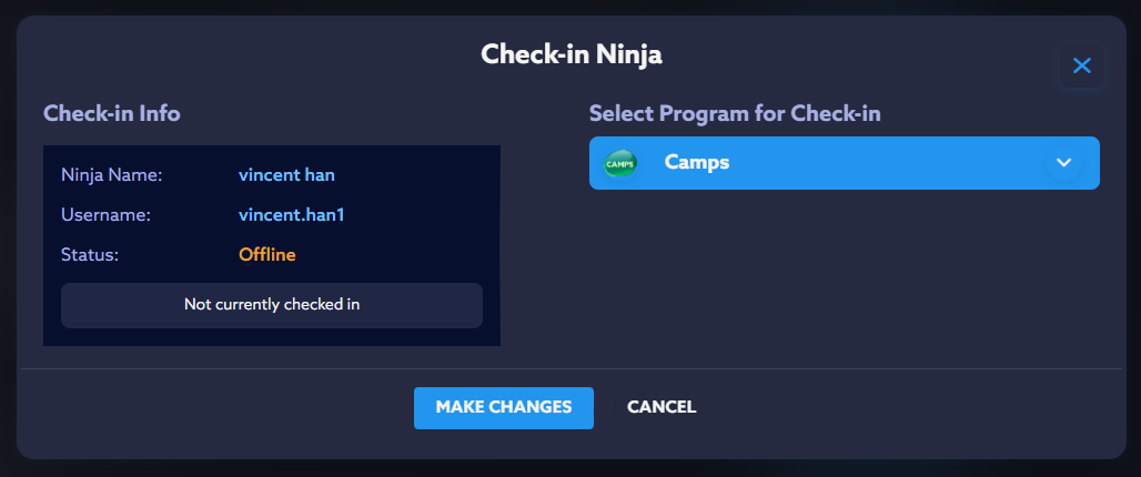 4. Select the program from dropdown you want to Check-in the Ninja to.