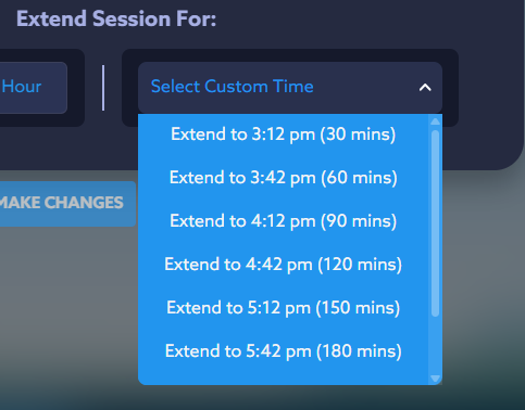 4. If you want a custom session extend, click on "Select Custom Time" dropdown, where you'll be able to see the custom session extend durations.