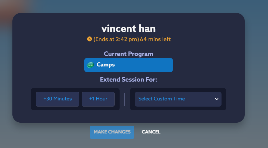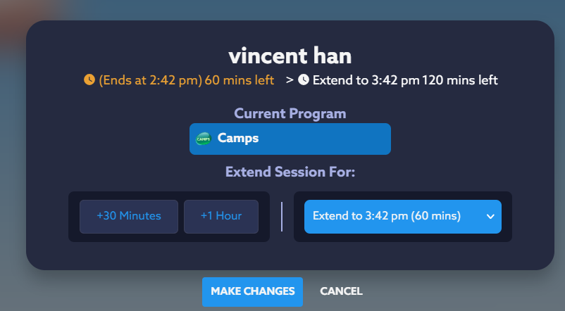5. Upon selection of the preferable session extension duration, you'll be able to see the Before and After Extend End time. To confirm your changes, press "Make Changes".
